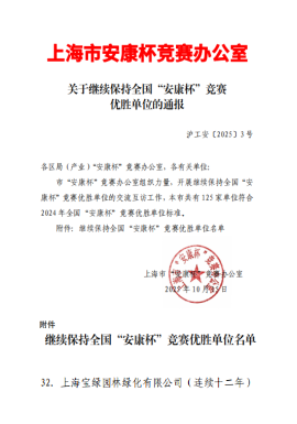 近日,宝绿公司收到关于上海市安康杯竞赛办公室下发的《关于继续保持全国“安康杯”竞赛优胜单位的通报》,公司已连续12年荣获全国“安康杯”竞赛优胜单位荣誉称号。